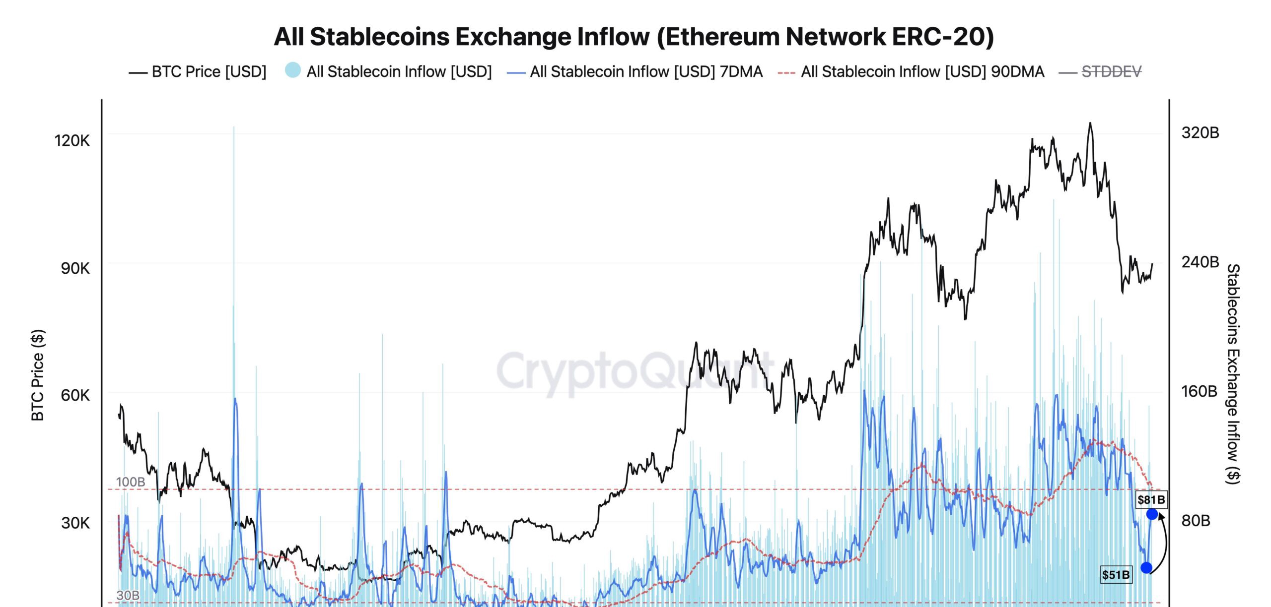 最初は劇的に見えないかもしれませんが、根底にある数字はより興味深いストーリーを語っています。週次のステーブルコイン流入の平均は、$51 億ドル程度からわずか1週間で約$81 億ドルに急増しました。その跳ね上がりは、最近数ヶ月を支配してきた下落トレンドを打ち破るのに十分です。