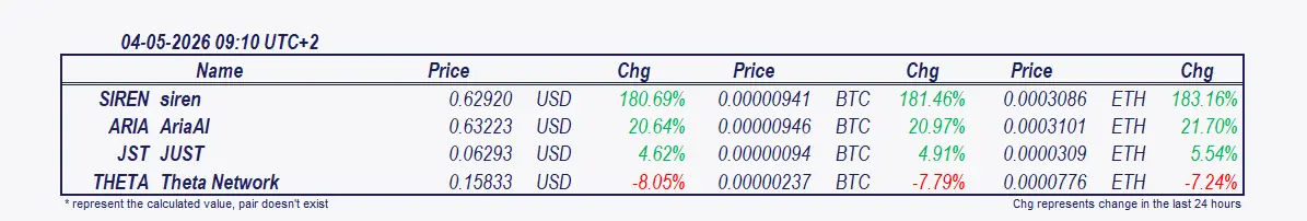 • AriaAIとJUST: 深夜0時以来、AriaAIは9.33%上昇し、JUSTは4.91%上昇しています。