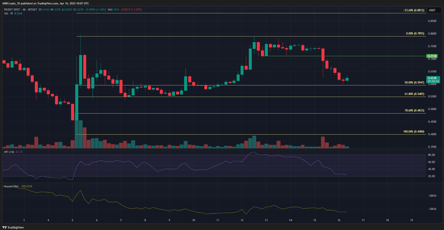 As of now, the Pi Network token price is approaching the 50% retracement zone, corresponding to the $0.595 mark.