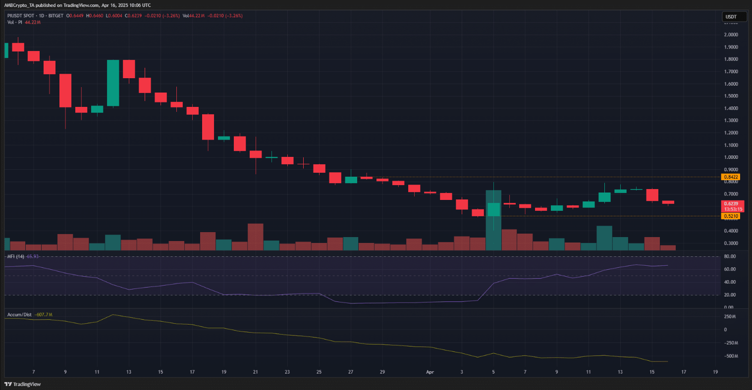 On (1D) day’s timeframe, the bearish trend remains evident with a series of lower highs and lower lows marked in orange. Two important price levels of $0.84 and $0.52 currently act as key support-resistance levels, potentially shaping PI’s further direction.