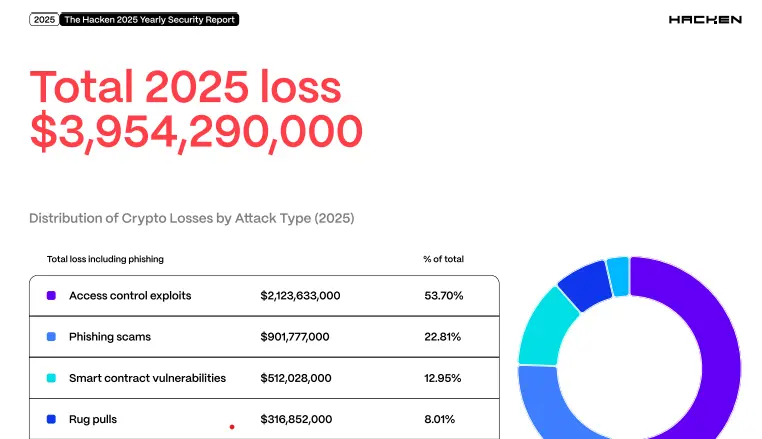 According to Hacken, access control failures and broader operational security breakdowns accounted for about $2.12 billion, or nearly 54% of all 2025 losses, compared with around $512 million from smart contract vulnerabilities.