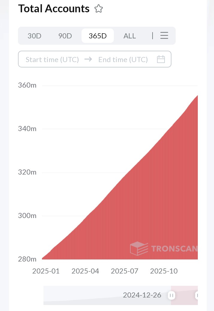 Apart from this, TRON is recording growth across other areas on the network. Confirming this is Tronscan data, which estimates that the total number of accounts on the network has increased by 26.3% from year to date. In December, this reached its record high of 355.4 million. The data also suggests that over 240,000 new accounts are created on the network daily.