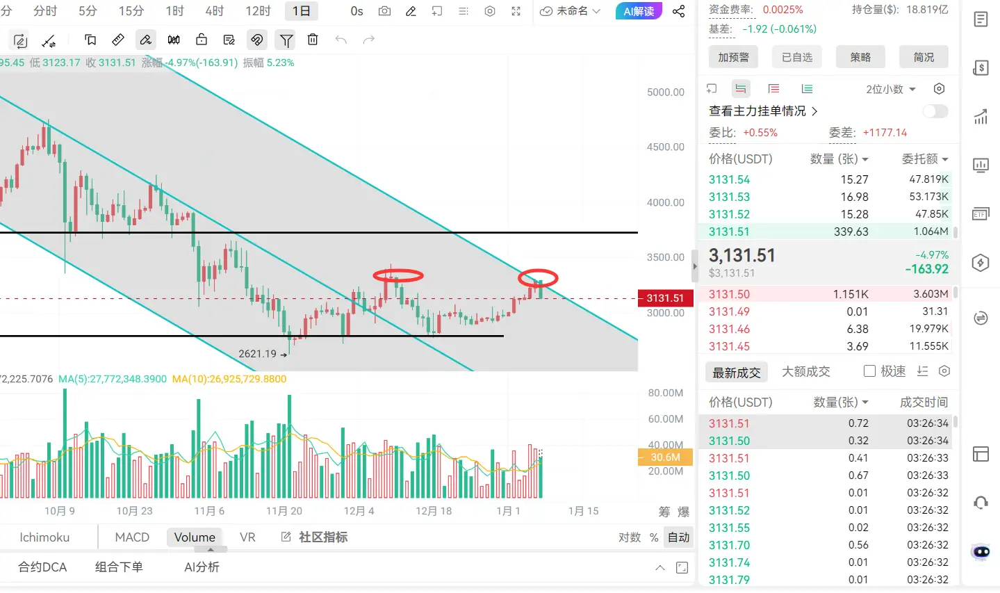 BTC: The 12H chart is currently facing strong resistance. After three attempts to surge and fall back in the last two weeks of 2025, and a half-month of accumulation, the effort to break through the 94,700 resistance level still shows weakness. Currently, it’s in a high-level oscillation rather than a one-way trend. The direction will depend on the data released in the next two days. Once the key support below is confirmed, the new trend will be determined. Bitcoin is now at 90,800. We need to watch whether the support at 88,000 can hold. The key position above is the bullish testing platform at 92,500. If it stabilizes, a new breakout could be even more vigorous. The strong resistance at 94,700 will turn into the next major support. If 89,000 cannot be effectively supported, late January will likely be a wide-range shakeout and consolidation. To sum up, the focus is on breaking through the key resistance level, rather than blindly accumulating at support levels. Yesterday’s movement was very typical: prices pushed up but lacked sustainability, then retraced for short-term trades, with some buyers stepping in. This indicates that the main force is not in a hurry to make a statement and won’t give retail traders a quick profit. It’s more about testing retail traders’ patience—if they can hold, they win; if not, they will be forced out.