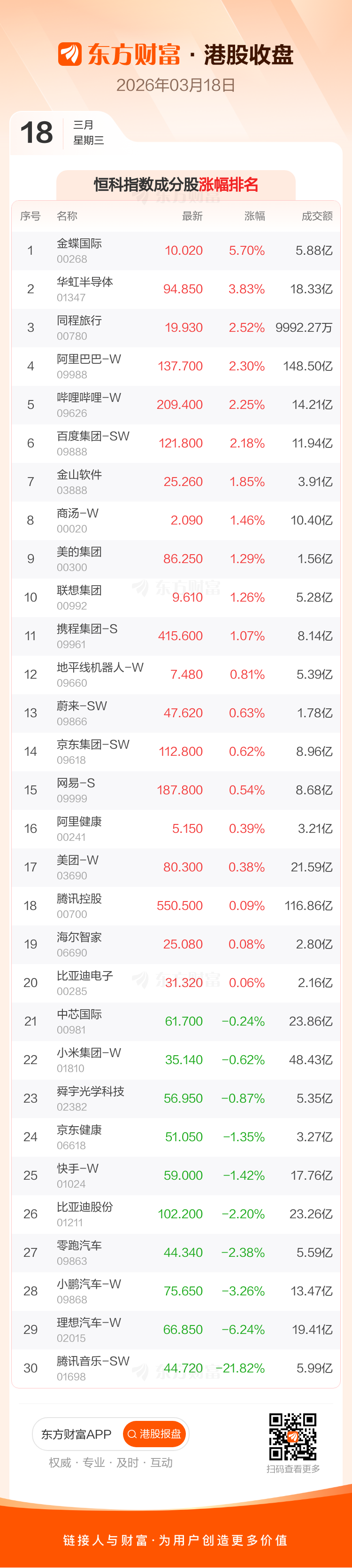 On March 18, the Hang Seng Index closed at 26,025.42 points, up 156.88 points, a 0.61% increase; the Hang Seng Tech Index closed at 5,108.3 points, up 0.66 points, a 0.01% increase. Among the Hang Seng Index components, Zhongtong Express-W, New Oriental-S, and China Biological Pharmaceutical saw the largest gains, while Li Auto-W, Longfor Group, and Geely Auto experienced the largest declines. Among the Hang Seng Tech Index components, Kingdee International, Huahong Semiconductor, and Tongcheng Travel led the gains, while Tencent Music-SW, Li Auto-W, and Xpeng Motors-W saw the largest declines.