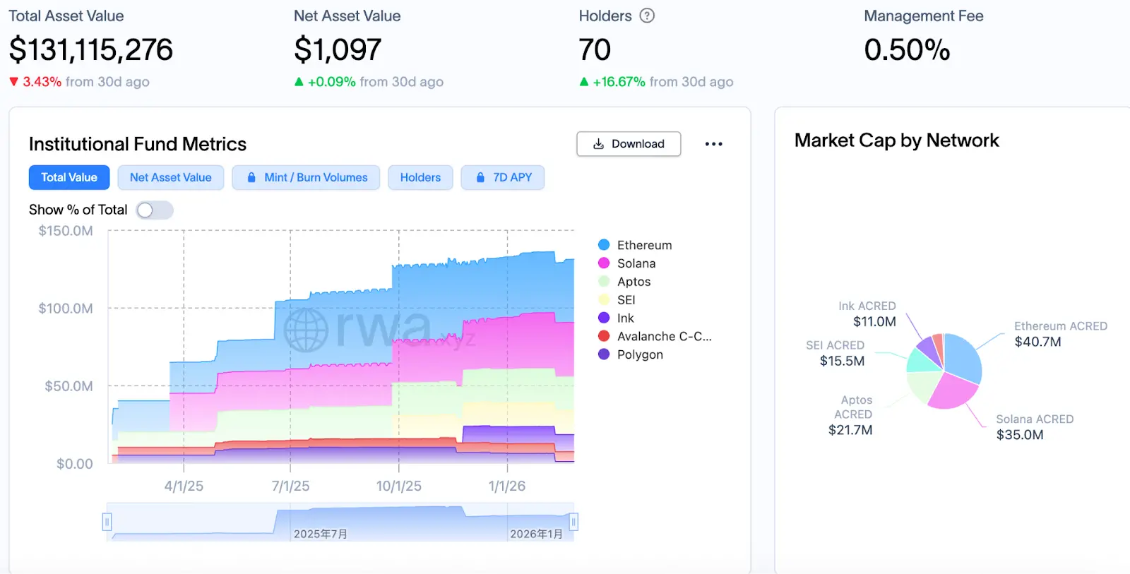 Apollo’s assets under management are close to $940 billion. Its private credit business is already known for pursuing high yields. The on-chain world offers it opportunities for leverage amplification and global real-time liquidity. Since it began exploring the crypto sector in 2024, using RWA as its main battlefield, and in cooperation with Securitize, it has tokenized its diversified credit strategy into ACRED; its current scale has reached $130 million.