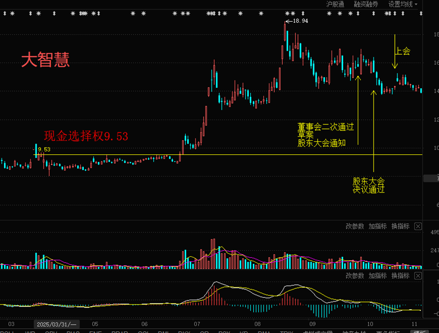 市場は常に正しい。市場の懸念は非常に合理的であり、今後の株価が現金選択権を上回らなければ、失敗の確率は非常に高い。逆に上回れば成功する**(因果関係を逆にしないでください)**。類似の参考として湘財股份の吸収合併と大智慧(下図)。
