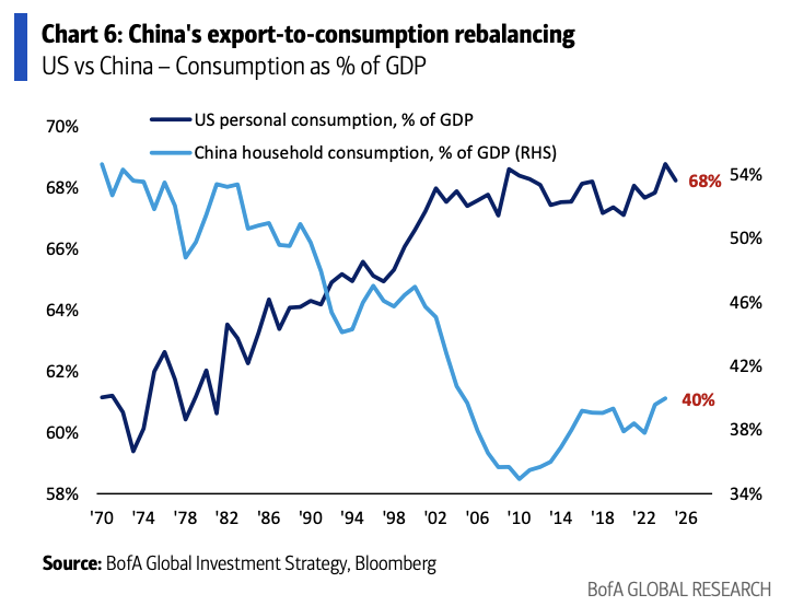 China assets: The “U.S.-China May meeting” and the reshaping of China’s consumer spending structure are the core catalysts. Data shows that China residents’ consumption as a share of GDP remains far below that of the U.S., leaving significant room for rebalancing. China assets therefore have substantial upside elasticity for valuation repair.