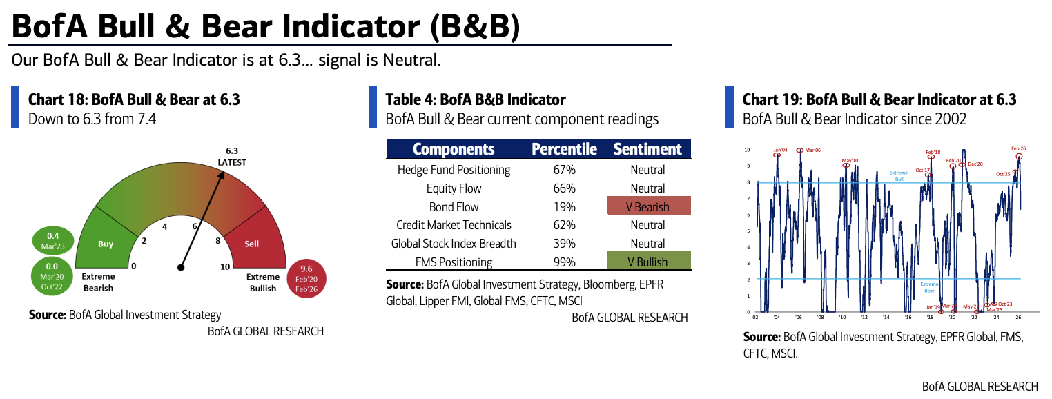 Meanwhile, the Bank of America bull-bear indicator plunged from 7.4 to 6.3, hitting a new low since June 2025; the week-on-week drop is also the largest since April 2025. The “sell signal” has been lifted. The main drag factors are a sharp net outflow from high-yield bonds and worsening breadth in global equity indexes.