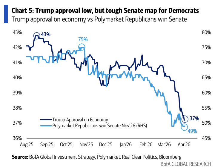 From a political perspective, Trump’s ongoing approval declines are re-pricing the landscape for the midterm elections—the probability Republicans keep the House has fallen to 15%, while the probability they keep the Senate has also slipped to 49%. The core policy risk for Q2 is that trade policy may again become a tool for the U.S. to apply pressure to achieve geopolitical goals.