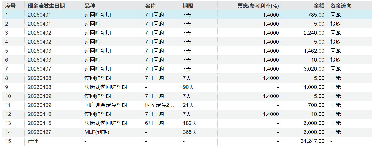 On April 8, 11,000 billion yuan of 3-month buyout-style reverse repos will mature; at that time, the net cash drainage corresponding to that term of buyout-style reverse repos will be 3,000 billion yuan.