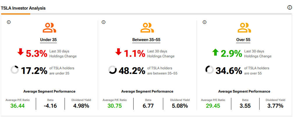 Investor sentiment in the recent quarter is described as being neutral, compared to the positive sentiment recorded when we last looked at Tesla Crowd Wisdom just before Christmas. Some of the most negative have been people in the under 35 age bracket with a 5.3% decrease in holdings over the last 30 days and those between 35 and 55 with a 1.1% slide. Those over 55, who represent a third of all Tesla investors, have recorded a 2.9% rise.