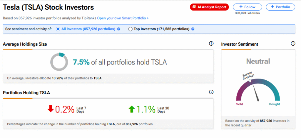We base this data on sentiment and activity around the stock in 857926 investor portfolios. It shows that over the last 30 days the number of portfolios holding Tesla stock is up 1.1%. However, over the last 7 days it is down 0.2%.