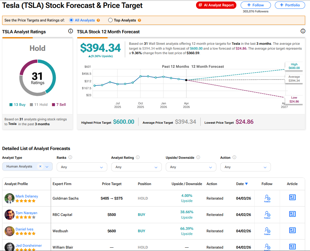 On TipRanks, TSLA has a Hold consensus based on 13 Buy, 11 Hold and 7 Sell ratings. Its highest price target is $600. TSLA stock’s consensus price target is $394.34, implying a 9.36% upside.