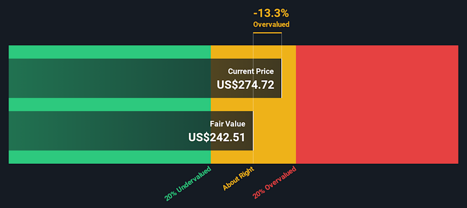 When all those projected cash flows are discounted back, the model arrives at an estimated intrinsic value of $209.38 per share. Compared with the recent share price of $314.94, this implies the stock is around 50.4% overvalued according to this DCF approach.