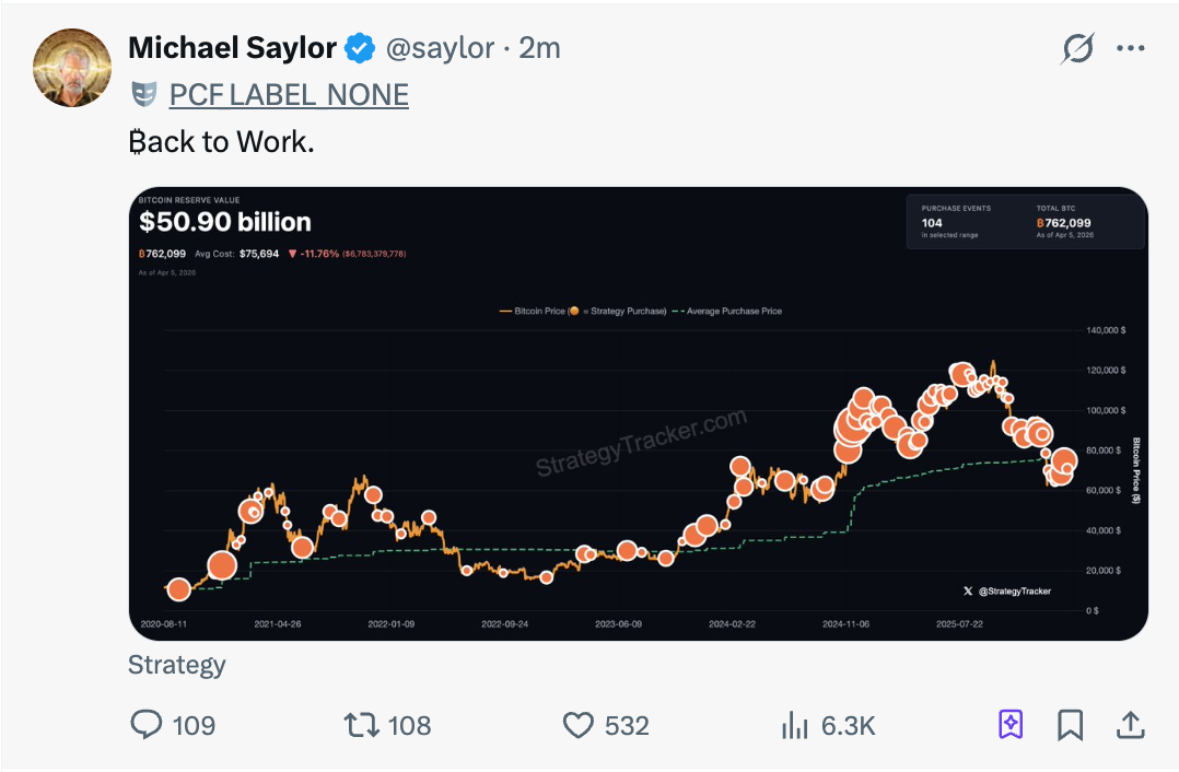 Deep Tide TechFlow message, 04 月 05 日, Strategy founder and Executive Chairman Michael Saylor again posted Bitcoin Tracker-related information on the X platform and wrote “₿ack to Work.”