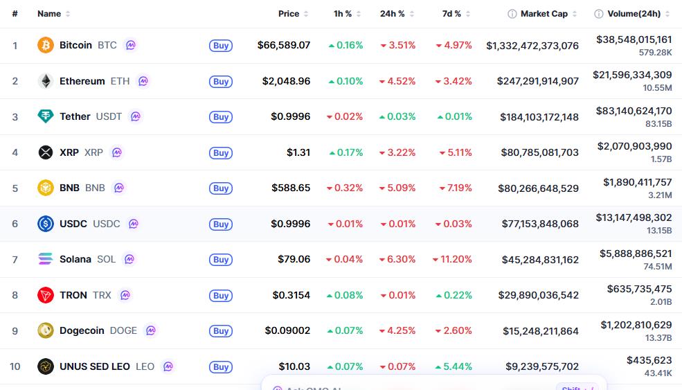 Bitcoin hovered around $66,600 Ethereum dropped near $2,050 XRP traded around $1.31 BNB held near $590 Solana led losses among major altcoins