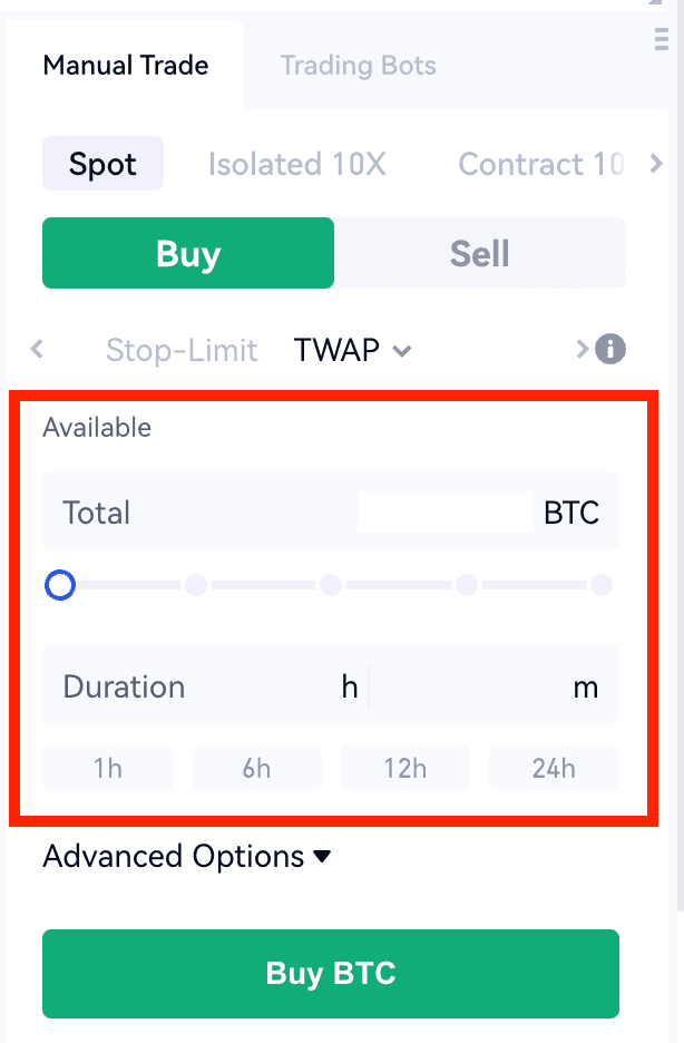 Suponha que Jack queira comprar 1BTC em 6 horas. Na configuração básica, ele só precisa inserir a quantidade total de 1BTC e a duração de 6 horas.