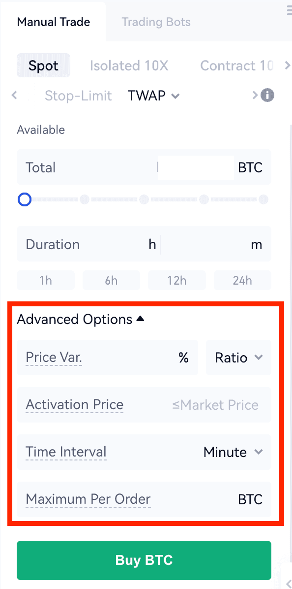 Existem configurações básicas e opções avançadas na configuração da estratégia TWAP. A configuração básica é muito mais fácil, pois o sistema executa a estratégia automaticamente. Os traders podem personalizar sua estratégia TWAP clicando em "Opções Avançadas".
