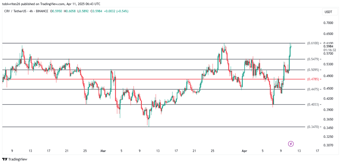 O CRV pode passar por uma leve correção antes de continuar a tendência de alta. Neste momento, o preço está se aproximando da importante zona de resistência em torno de $0,61 – uma área que anteriormente fez com que o CRV fosse rejeitado na última tentativa.