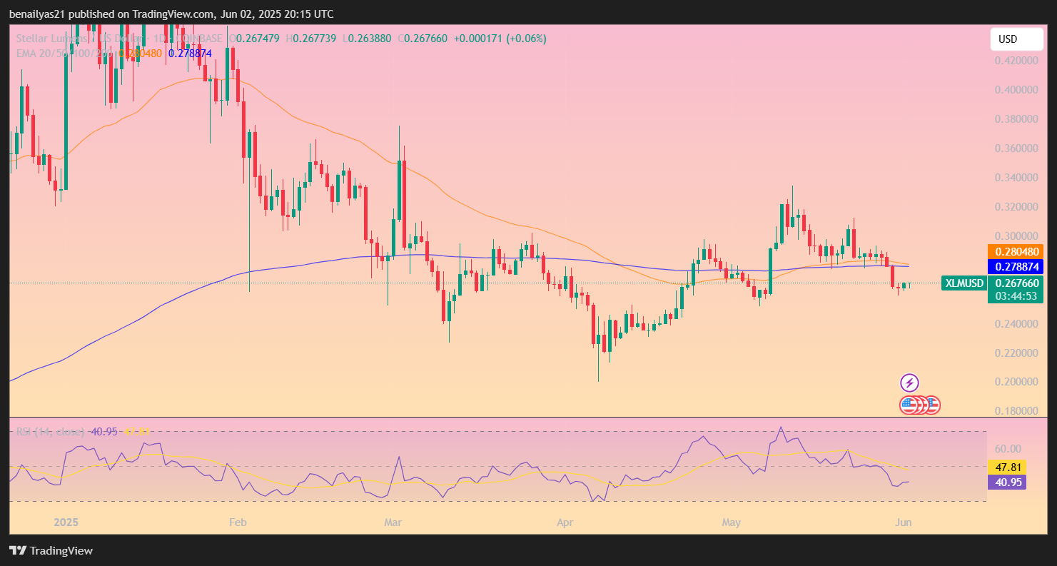 Entre meados de abril e início de junho, o XLM manteve-se dentro de uma faixa entre $0.24 e $0.30, criando uma base sólida em $0.26. Embora o volume de negociação tenha sido tranquilo, esta estabilidade sugere que os traders têm acumulado em vez de sair das posições. Cada queda perto da marca de $0.26 viu novos compradores entrarem no mercado, mantendo a zona de suporte.