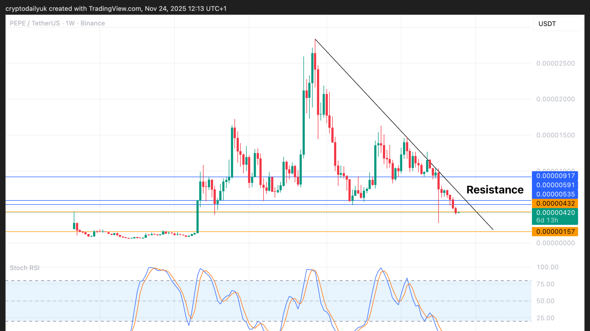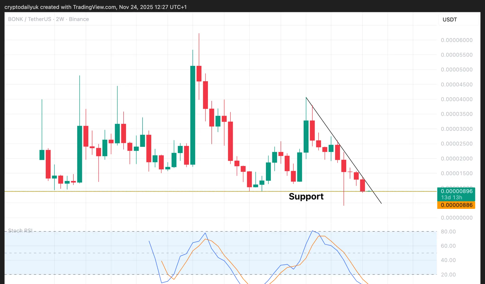 Os indicadores Stochastic RSI praticamente caíram para o fundo. Portanto, o impulso de preço para cima necessário para outro grande rali pode não estar muito longe. Supondo que ocorra uma quebra, colocar um stop loss apertado abaixo da linha de tendência descendente ajudaria a proteger contra uma falsa saída. Cuidado: os stops para memecoins podem não ser acionados.