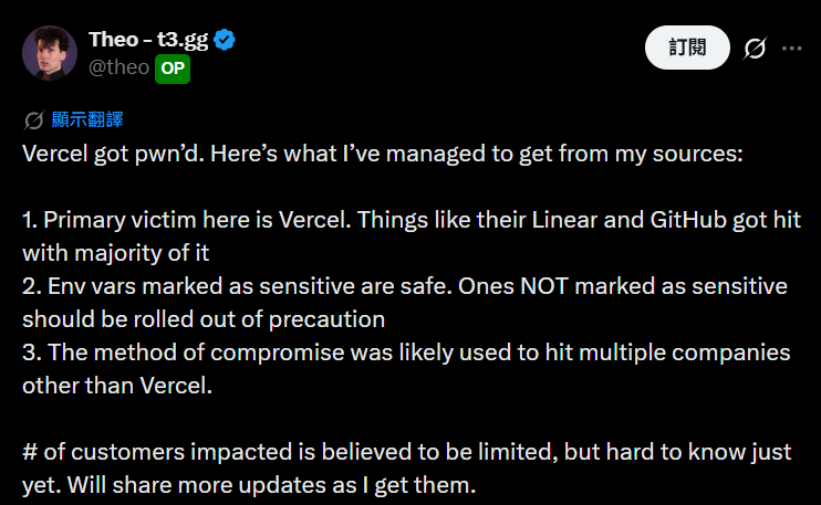 O desenvolvedor e influenciador Theo Browne também comentou, afirmando que fontes indicam que a integração interna do Vercel com Linear e GitHub foi a mais afetada.