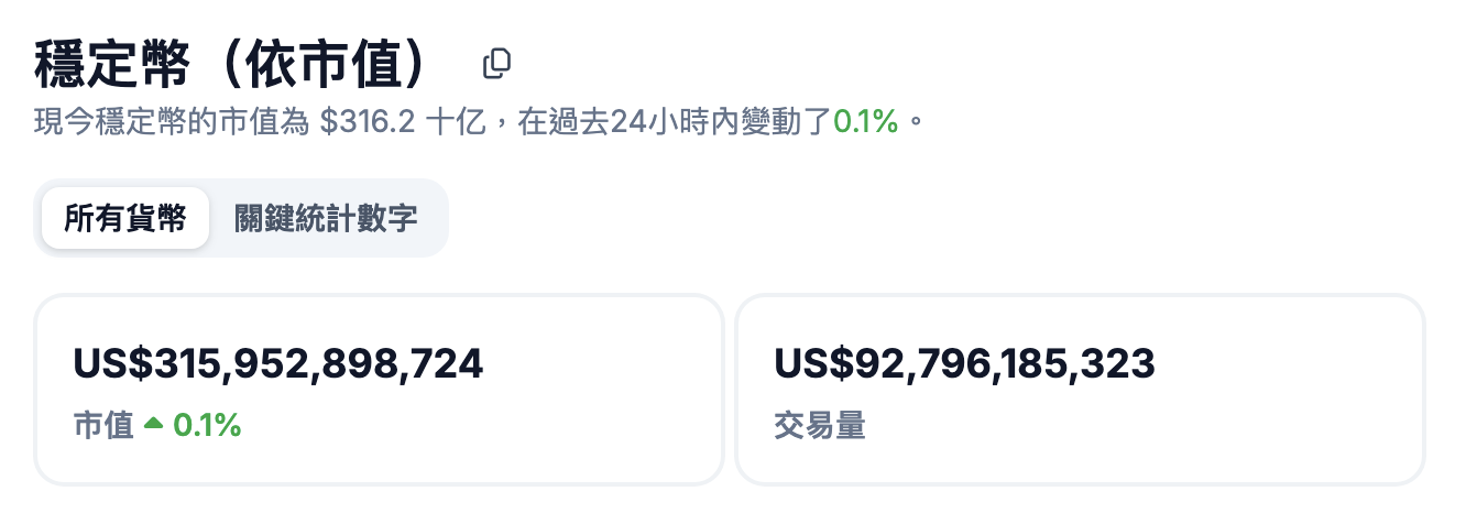 À medida que o mercado de ativos digitais se expande rapidamente, o papel das stablecoins no sistema financeiro torna-se cada vez mais importante. Segundo dados recentes do CoinGecko, atualmente a circulação global total de stablecoins é de aproximadamente 315,9 bilhões de dólares, sendo que a maior parte está atrelada ao dólar americano.