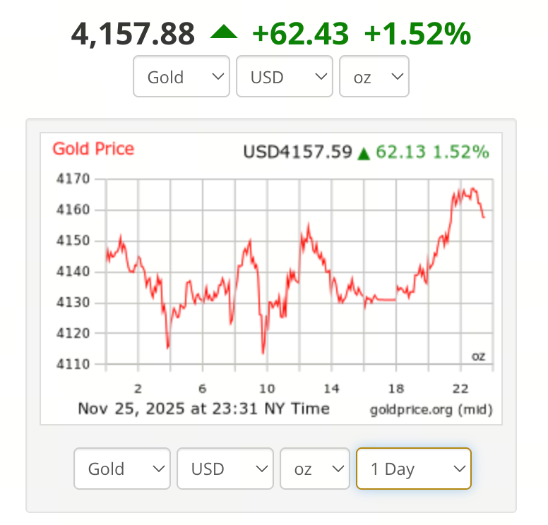 A 26 de novembro de 2025, o preço internacional do ouro spot fixou-se em cerca de 4 151,88 $ por onça, registando uma valorização de 0,45 % face à sessão anterior. Os preços do ouro têm oscilado de forma acentuada nos últimos meses, atingindo máximos históricos no início do ano, antes de recuarem devido à realização de mais-valias e à alteração do sentimento do mercado. Apesar do ajustamento, os preços mantêm-se substancialmente acima dos valores do ano anterior, e, de um modo geral, o ouro apresentou um desempenho sólido em 2025, continuando a atrair forte interesse dos investidores.