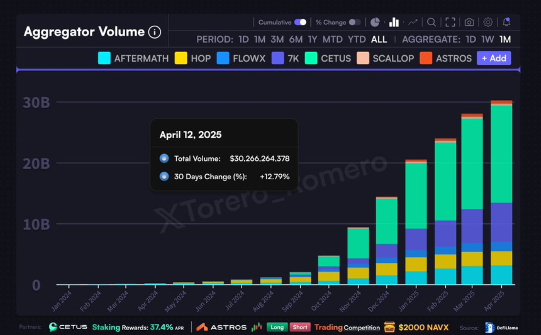 O volume total de transações SUI nas plataformas agregadoras atingiu 30 mil milhões de USD, refletindo o crescente interesse por este ecossistema.