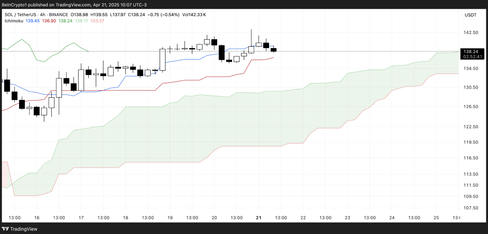 Se Solana conseguir se recuperar da linha Kijun-sen e cruzar Tenkan-sen, a tendência de alta provavelmente será estendida. Por outro lado, se a recuperação não se manter, o preço pode testar novamente a borda superior da nuvem como a próxima zona de suporte.