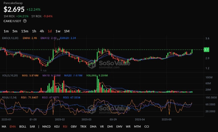 Fonte: CoinMarketCapA ação do preço vem após uma recuperação de um mês, onde o CAKE se recuperou em mais de 26% de sua mínima de abril de $1.61. Essa zona de suporte agora parece sólida à medida que o momentum se constrói. O rali não se trata apenas de vibrações de mercado—há uma infraestrutura real impulsionando esse movimento.