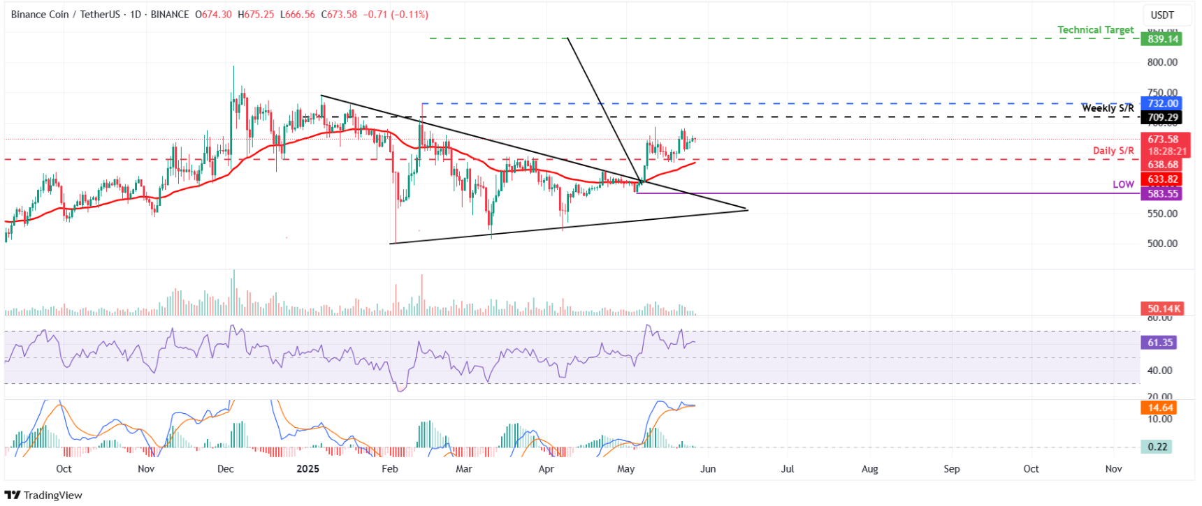 Se o momento positivo atual for sustentado, o BNB poderá se mover em direção ao alvo técnico identificado a partir do padrão de triângulo simétrico em US$ 839,14 – o que equivale à distância entre o primeiro pico e o fundo no padrão mais o ponto de rutura. No entanto, este é um objetivo teórico; Na verdade, os traders podem optar por obter lucros nas principais zonas de resistência, como o preço semanal em torno de US$ 709,29 ou o pico de 13 de fevereiro em US$ 732.