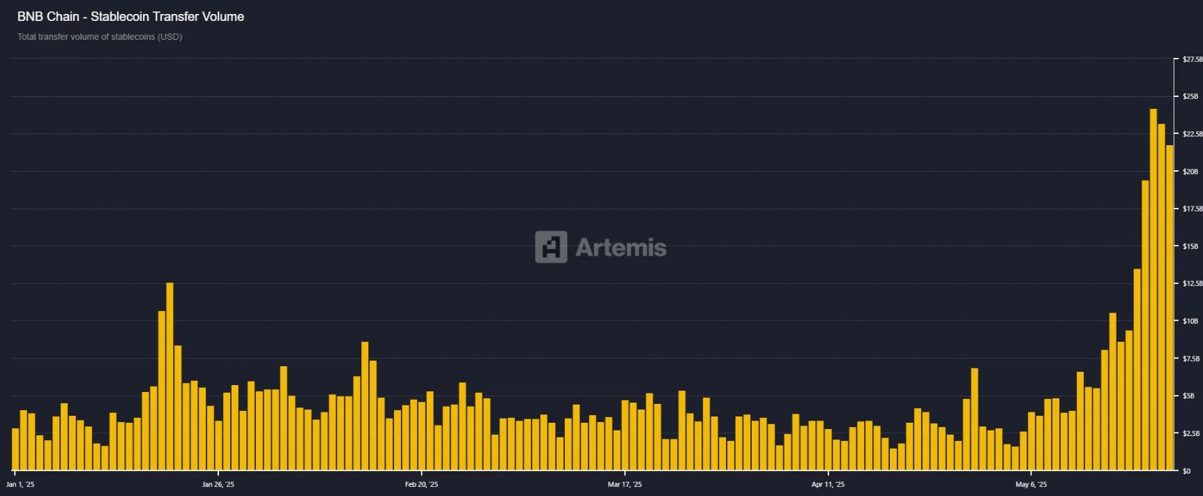 O valor das stablecoins em circulação na rede BNB registrou um crescimento impressionante, atingindo US$ 24,2 bilhões em 21 de maio – o maior número desde o início do ano (YTD), segundo dados da plataforma Atermis. Embora o volume de negociação tenha diminuído um pouco nos últimos dias, a atividade na rede permanece positiva graças ao grande número de stablecoins, contribuindo para promover o uso da rede e expandir a atratividade do ecossistema para novos usuários.