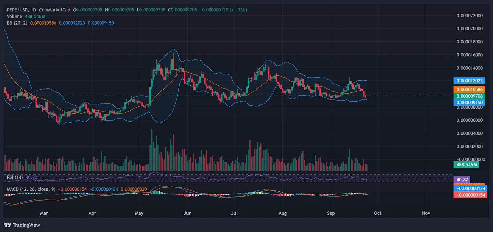 Apesar da sua estreia na Suécia, tanto o FLOKI como o PEPE perderam mais de 10% na última semana. O PEPE está a ser negociado perto de $0.0000097 após ter tocado na Banda de Bollinger inferior, com o RSI a 40.82 a mostrar um fraco momento.