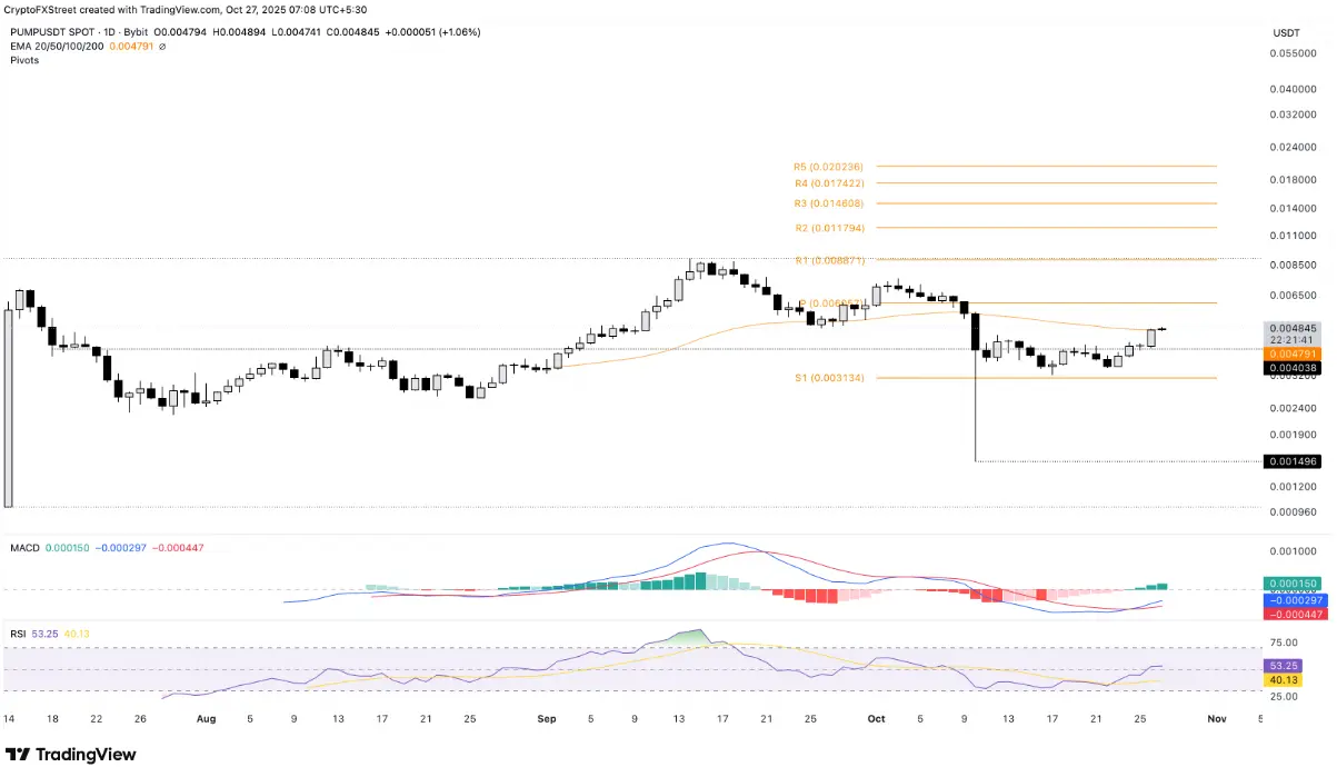 No momento da redação, na segunda-feira, Pump.fun (PUMP) está mantendo sua posição na linha EMA de 50 dias a 0,004788 USD, indicando uma tendência estável após um forte aumento. Este token continua a subir 1% no dia, dando continuidade a um aumento de 15% na sessão anterior.