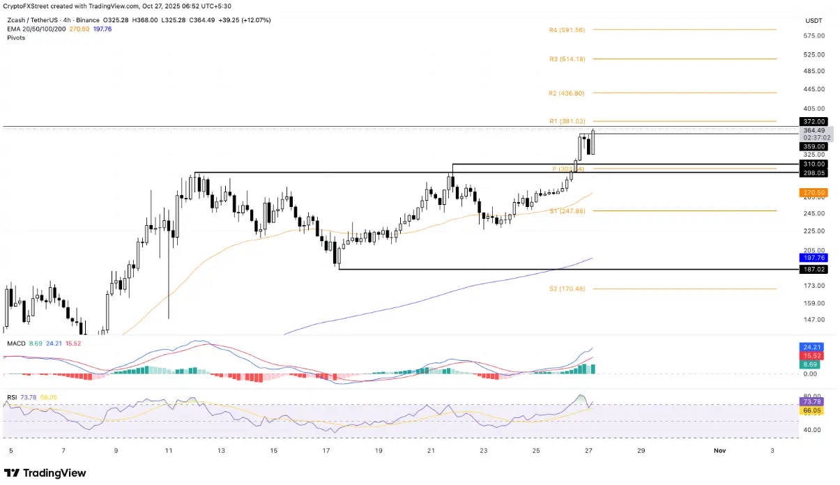 À data da redação deste artigo na segunda-feira, Zcash (ZEC) registou um aumento de 12%, continuando o impulso de 17% no domingo. Com uma série de cinco sessões de alta consecutivas, esta moeda anónima está a aproximar-se da zona do pico histórico de 372 USD e da resistência R1 Pivot Point em 381 USD — dois marcos considerados barreiras técnicas importantes no gráfico de 4 horas.
