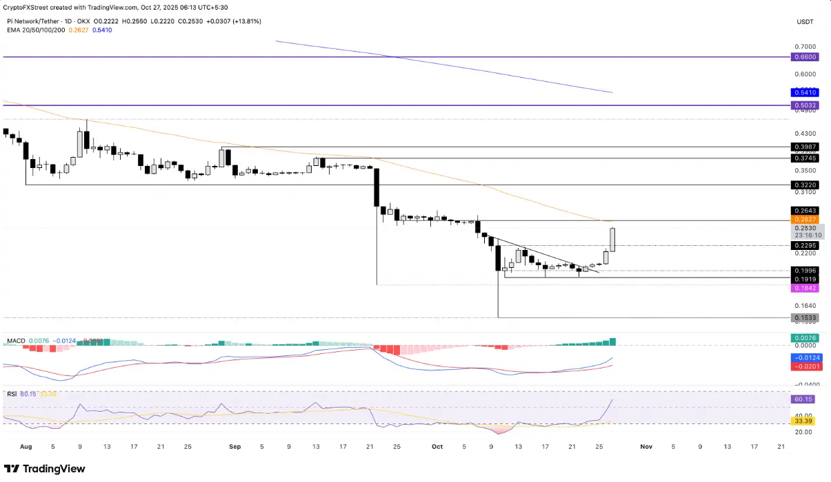 Até o momento da redação, o Pi Network (PI) está sendo negociado em torno de 0,2500 USD, aproximando-se da linha EMA de 50 dias em 0,2627 USD. Este token registrou um aumento de 13% nas últimas 24 horas, seguindo uma alta de 7% desde domingo, indicando que a demanda está voltando.
