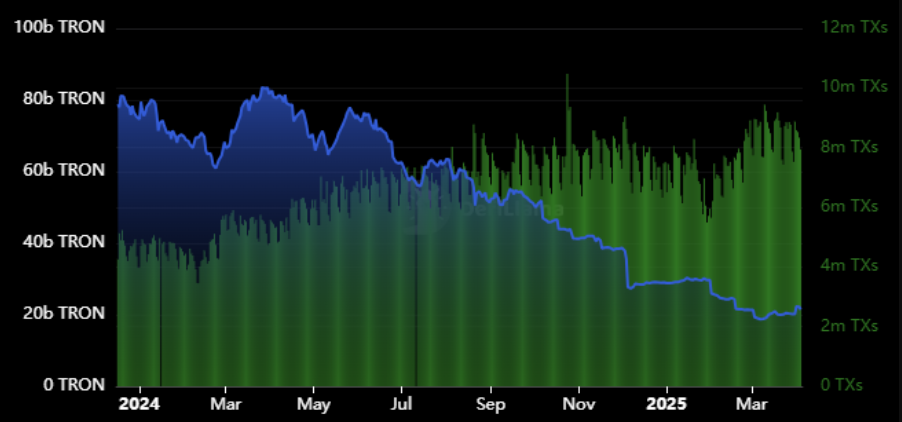 Тем не менее, несмотря на рост цен и объемов торговли, некоторые фундаментальные показатели Tron показывают противоположную тенденцию. В частности, общая заблокированная стоимость (TVL) в сети резко уменьшилась за последние 12 месяцев, снизившись с 81,76 миллиарда TRX 1 апреля 2024 года до 22,32 миллиарда TRX в начале апреля 2025 года.