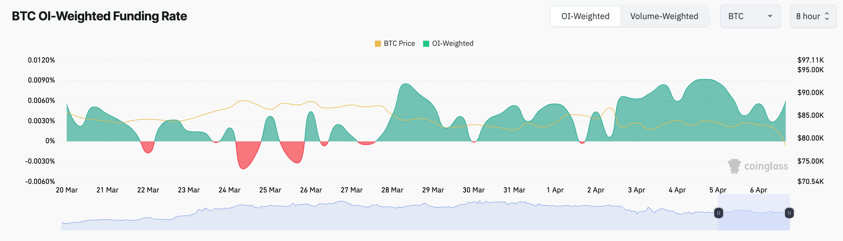 ! График курса финансирования Bitcoin | Источник: CoinglassСтавка финансирования — это периодический расчет между длинными и короткими трейдерами по бессрочным фьючерсным контрактам, помогающий поддерживать цены контрактов в соответствии со спотовым рынком. Положительная ставка финансирования означает, что трейдеры, держащие длинные позиции, платят комиссию тем, кто держит короткие позиции, что указывает на то, что большинство трейдеров по-прежнему делают ставки на рост цены.
