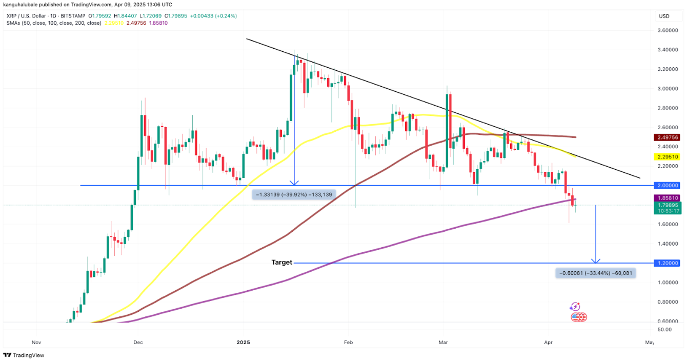 На самом деле, 6 апреля XRP пробил ключевую поддержку на уровне $2, что вызвало предупреждение о возможности глубокой коррекции. В соответствии с этим, цена может упасть до уровня $1,20 к концу апреля, что соответствует снижению примерно на 33% по сравнению с текущим уровнем.