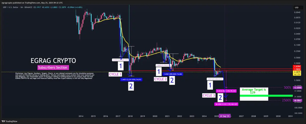 Анализируя данные из прошлых моделей, EGRAG предполагает, что если текущий цикл будет похож на Цикл 1, XRP может вырасти до $46.