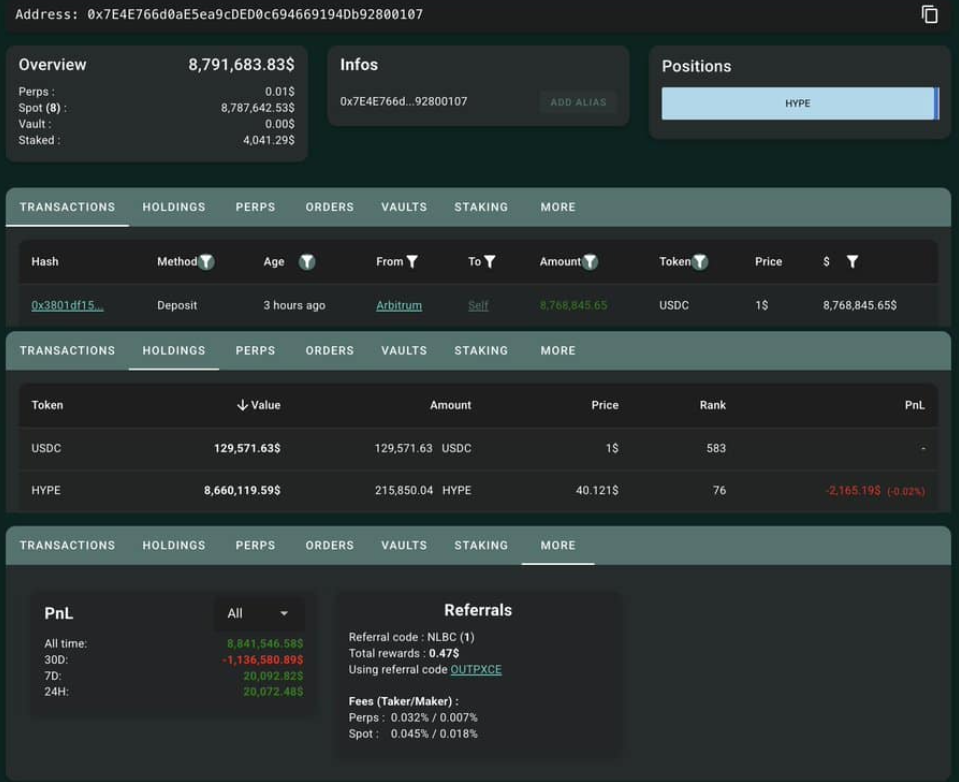 Гигантские киты (имеются в виду инвесторы с большими активами) всегда могли взорвать рынок одним значительным торговым движением. На этот раз кит, который заработал на Hyperliquid 8,44 миллиона долларов, вернулся и произвел фурор среди инвесторов. Конкретно, этот адрес кошелька только что потратил более 8,66 миллиона долларов на покупку 215,850 токенов HYPE — эта цифра достаточно велика, чтобы повлиять на краткосрочный спрос и предложение.