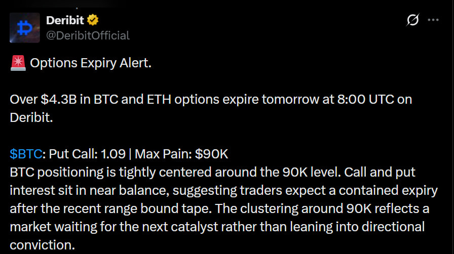 Внимание криптосообщества оставалось прикованным к зоне максимальной боли $90,000 — там, где быки по опционам могут понести наибольшие потери.