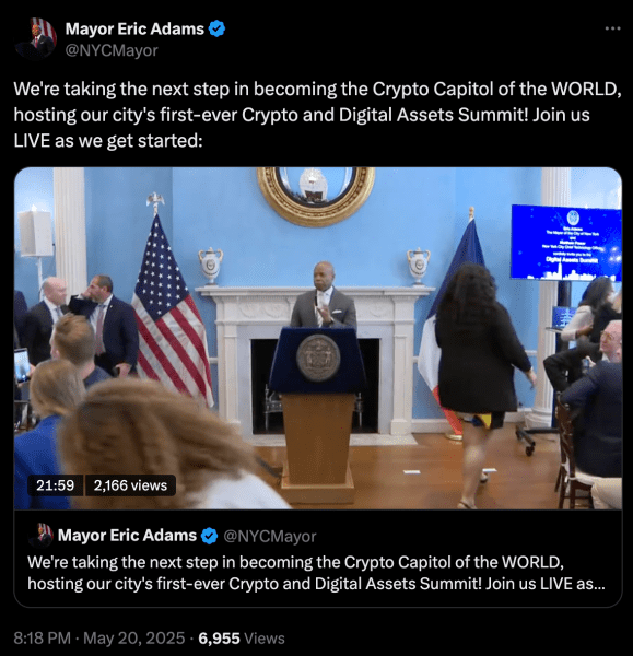 ! NYC Crypto Summit - โพสต์นายกเทศมนตรีบน X