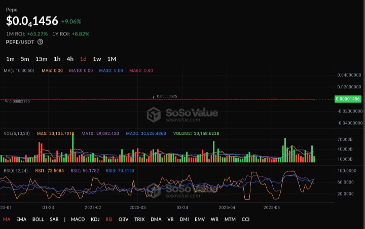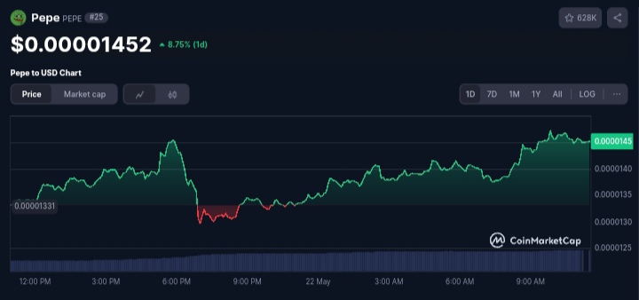 ! ที่มา: CoinMarketCapPepe ปัจจุบันซื้อขายที่ $0.0000141 และตามที่แสดงกิจกรรมและความสนใจของนักลงทุนที่เพิ่มขึ้นซึ่งได้รับแรงหนุนจากปริมาณการซื้อขายที่เพิ่มขึ้นอย่างมีนัยสําคัญในการฝ่าวงล้อมซึ่งเป็นโมเมนตัมเชิงกลยุทธ์ต่อ HODL และสะสม