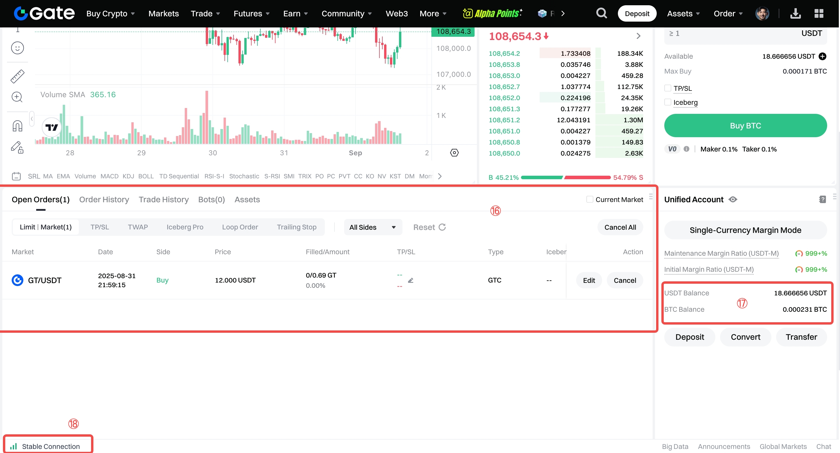 ⑯ Orders Section: includes [Open Orders], [Order History], [Trade History], [Bots] — view detailed order information