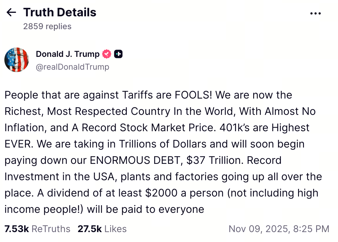 On November 9, 2025, President Trump announced via Truth Social his plan to distribute a $2,000 “tariff dividend” to every low- and middle-income American, funded by substantial import tariffs. In 2025, U.S. tariff revenues reached $195 billion. Trump contends that allocating a portion of these funds to dividends could also help alleviate the national debt.