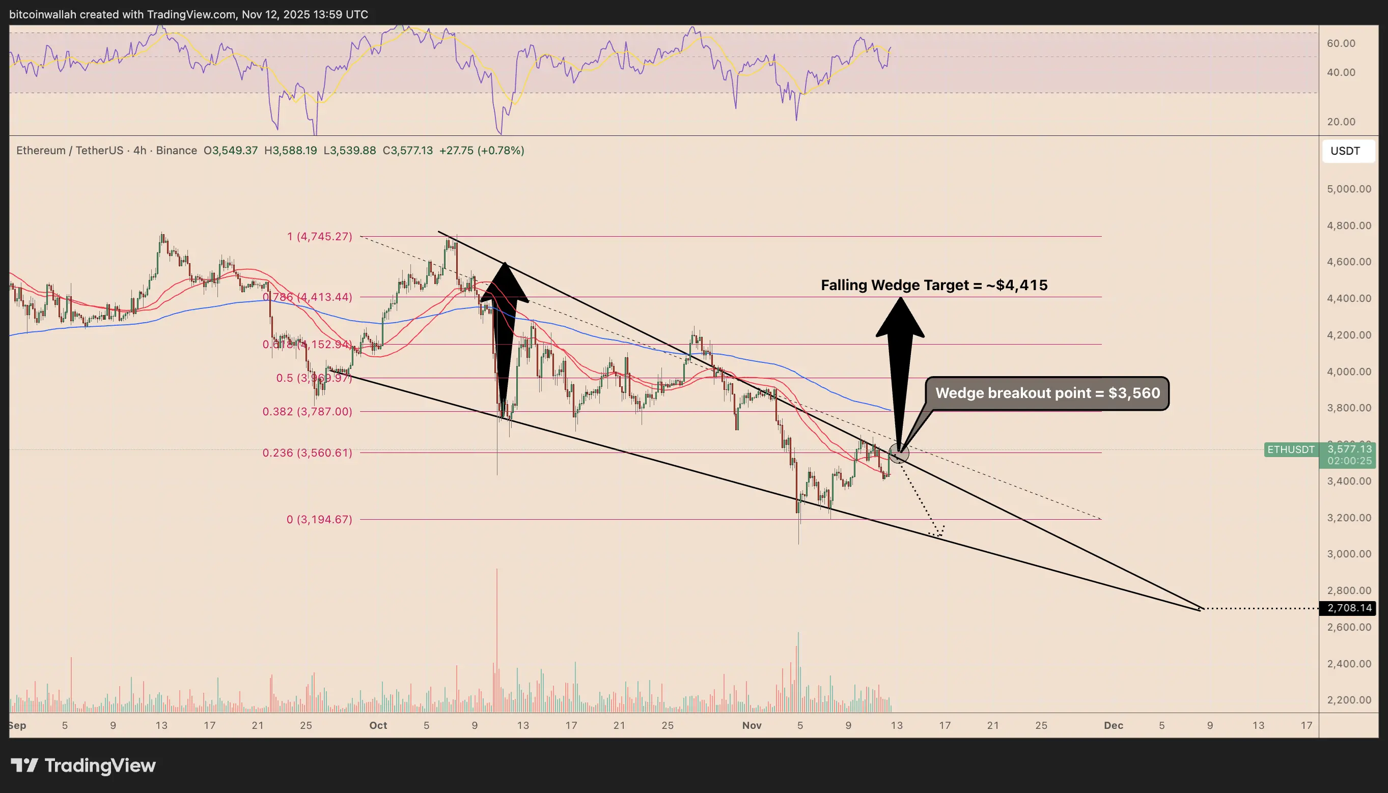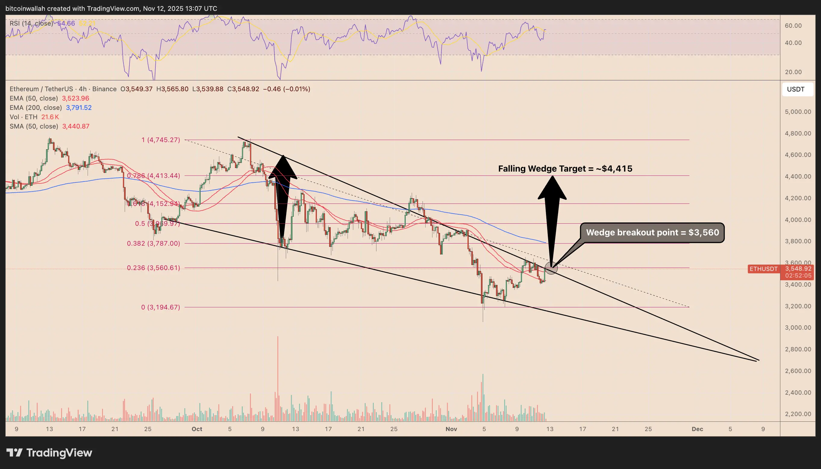 Düşen kama genellikle satış momentumunun zayıfladığını gösterir. Ether’in durumunda, bu yapı Ekim başından beri gelişmekte ve şu anda yaklaşık 3.560 dolar civarında bir kırılma noktasına yaklaşıyor. Bu seviye aynı zamanda %0.236 Fibonacci düzeltme seviyesine de denk geliyor.
