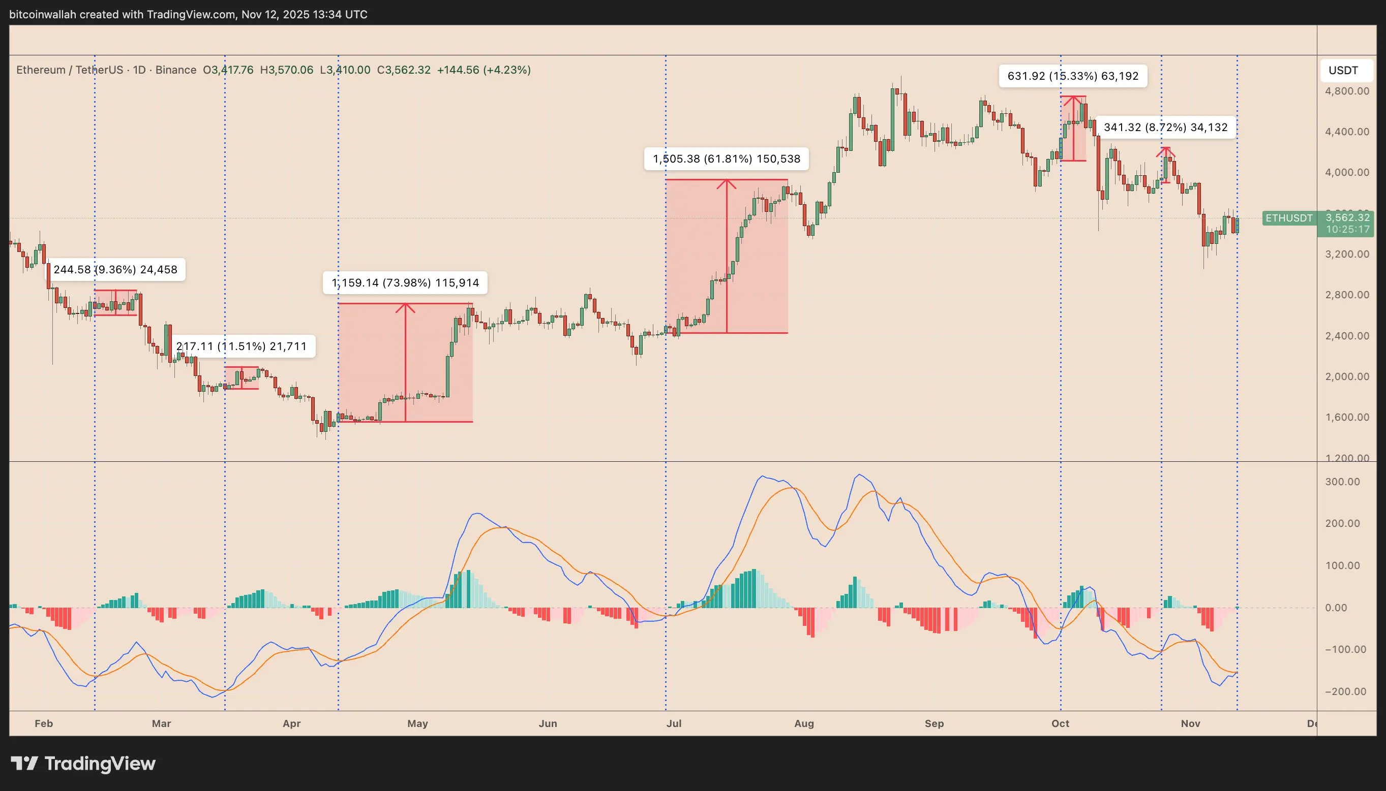 Tarihsel olarak, benzer MACD dönüşleri, konsolidasyon dönemlerinde ETH’nin kısa ve uzun vadeli rallilerinin önünü açmıştır.