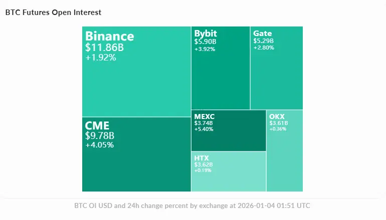 Open Interest: Total $57.8B, up +1.66% in 24h, indicating continuous influx of new capital